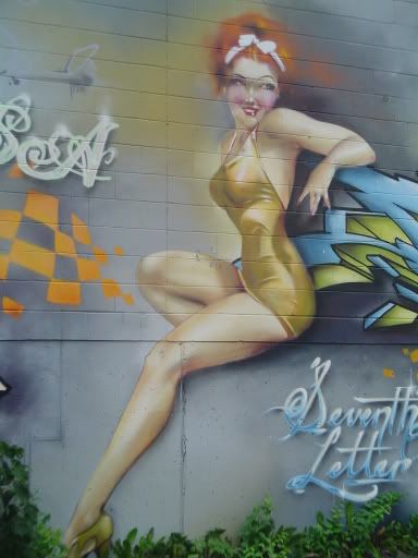 Behind the Midas near Keele station there's a bunch of graffiti. Did I spell that right? Anyway, there's this bomber girl and I love her and I have been meaning for about a year to take a picture of her and I finally did. Very excited!