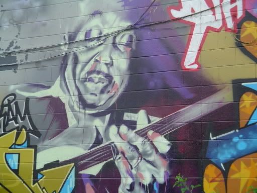 On the back of the building was also this guy ( I know some smart ass is going to come up and tell me that it's BB King or something...but I'm not sure enough to state any definate names here...), who I haven't noticed before, but who is really well done as well. I don't know that I could control the spray from the can so well...and of course I could never commit such an illegal act! cough. I'd be too chicken.