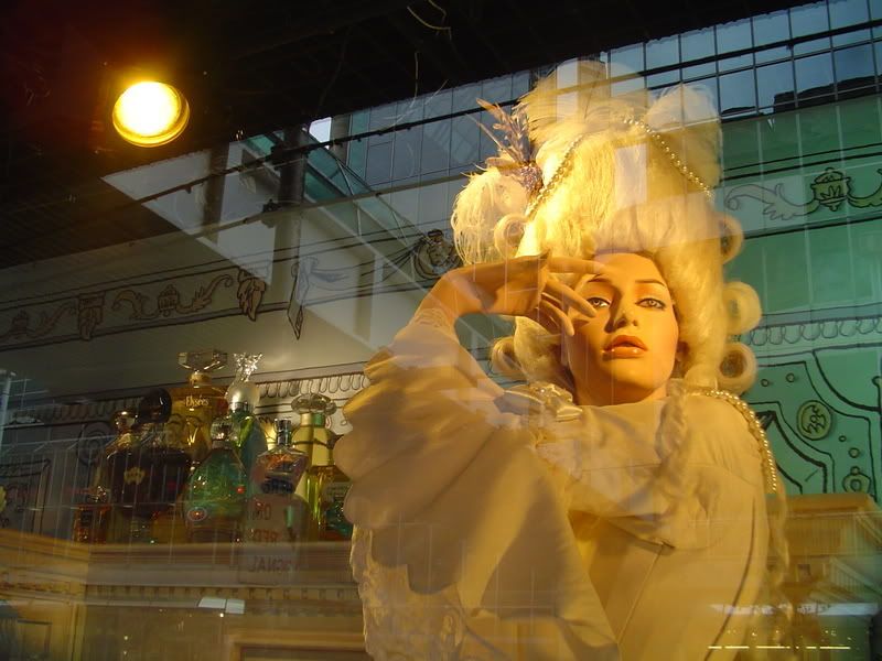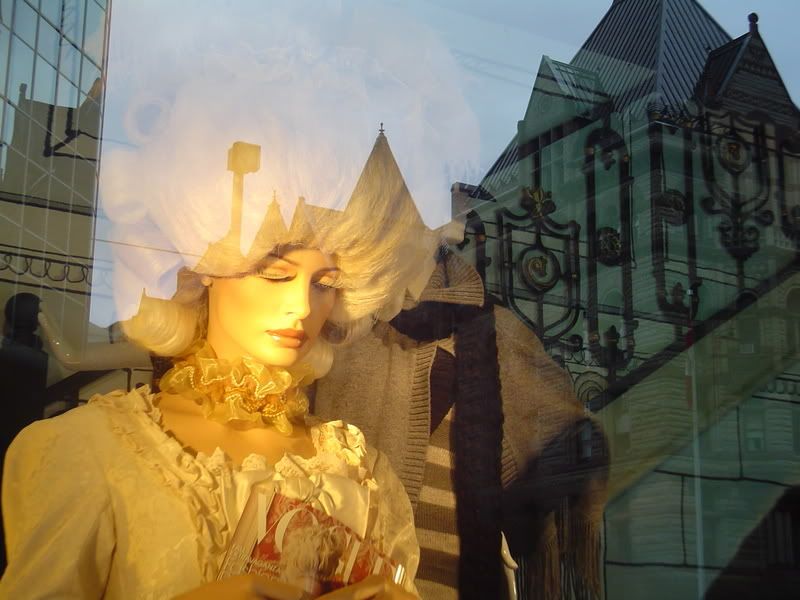 Went down town today and checked out The Bay windows. If you're not from Toronto, you might not know that they usually have fantastic displays at Christmas time. Occasionally they have some stunning displays during the rest of the year. This month they have displays for the Marie Antoinette film and Vogue magazine (because it has a feature about the movie). There's this whole connection with current fashion being affected (is that the right affect/effect?). I took tons of pictures. I loved the reflections in the windows and tried to play a bit with the glare and reflection of the city in the composition. Anyway, here's some of the photos.